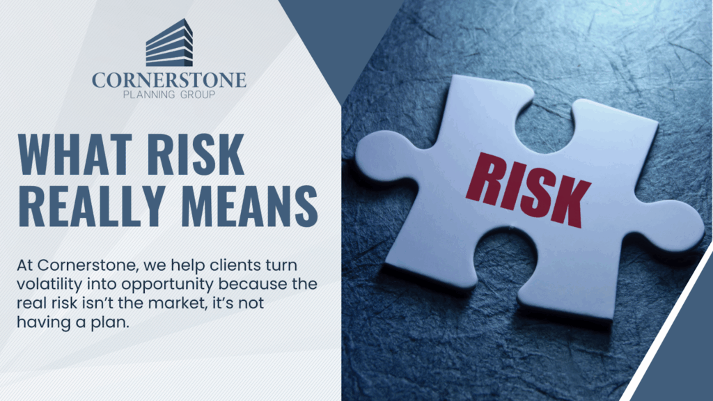 At Cornerstone Planning Group, we take a broader, more holistic view. Risk isn’t just about short-term losses – it’s about the potential for misalignment between your financial life and the future you’re planning for. And the most dangerous risk? Making decisions based on emotion, not strategy.